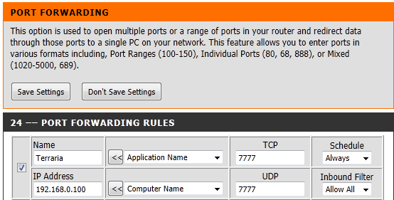 If you’re behind a broadband router, you may need to port forward port 7777 to the IP address of the computer that acts as your server, so that outside n00bs can connect. See example setup screenshot from my D-Link below.